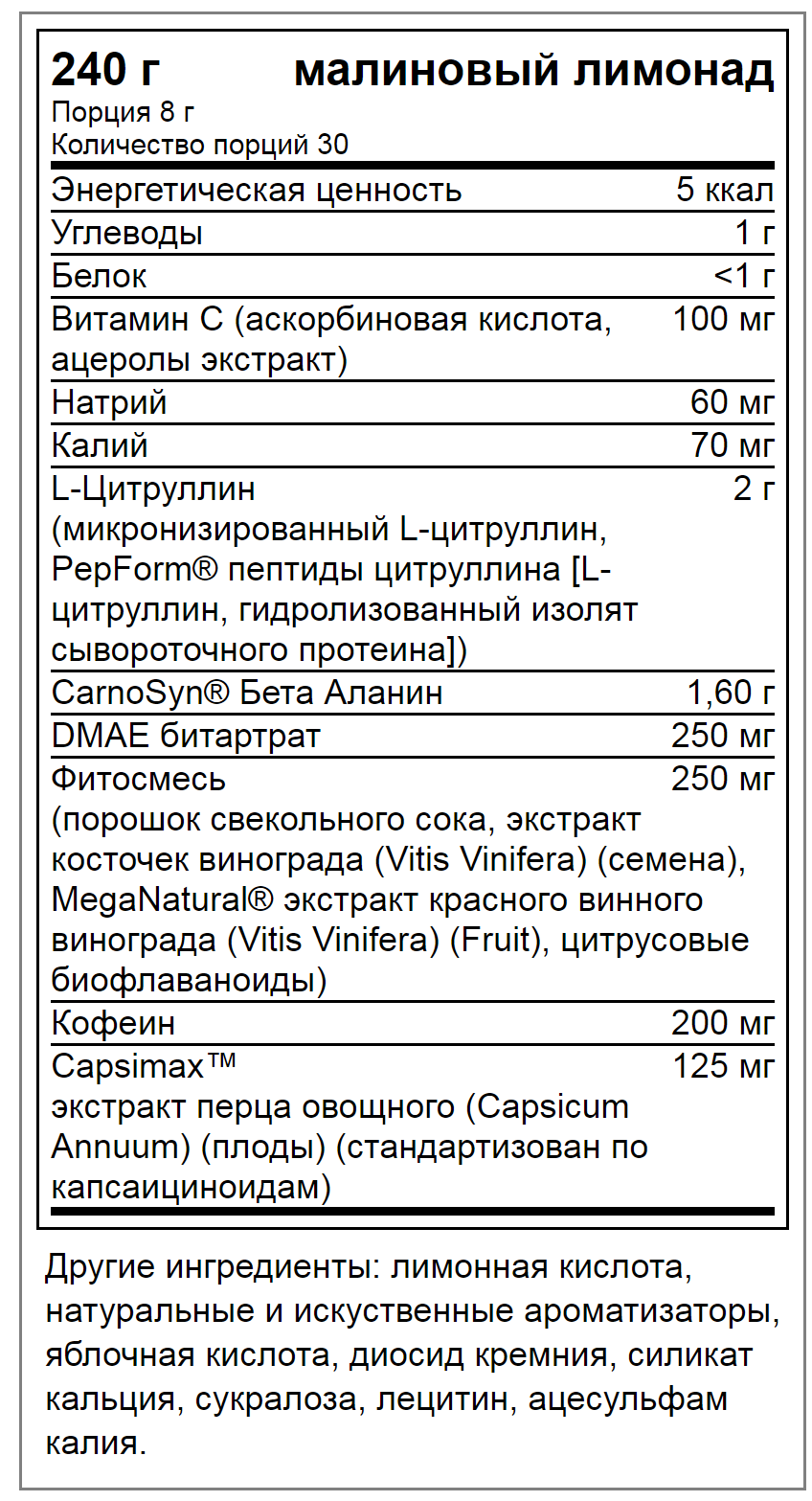 Комплекс в основе которого цитруллин малат, активизирующий эффект пампинга посредством улучшения производства N.O, что заставляет ваши кровеносные сосуды расширяться, обеспечивая тем самым мощный эффект мышечной накачки, рост силовых показателей и выносливости. Также в комплекс входит Бета-Аланин, который снижает выработку молочной кислоты во время тренировки, увеличивает силовые показатели и повышает анаэробную/аэробную выносливость, позволяя вам тренироваться дольше и продуктивнее.