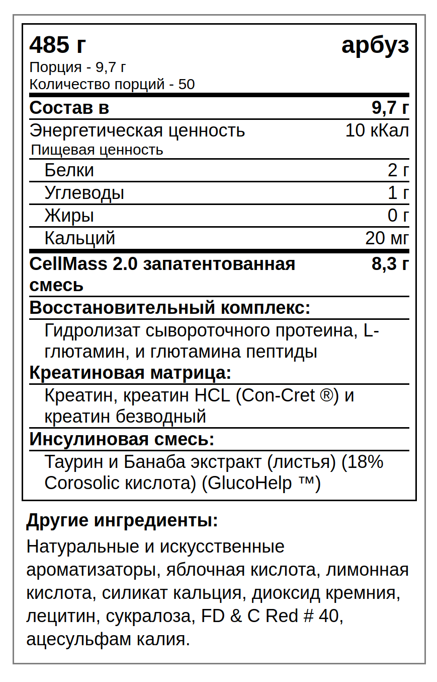 CellMass 2.0 является передовой добавкой среди современных концентрированных препаратов для восстановления. После интенсивной тренировки, мышцы находятся в состоянии повышенного стресса и должны быть возвращены в анаболическое состояние для того, чтобы восстановить поврежденные ткани, прокладывая путь для увеличения прочности и спортивные результаты. Для облегчения этой функции CellMass 2.0 с полностью переработанной формулой обеспечивает три формы креатина, а также глютамин, таурин и гидролизованный сывороточный протеин, предназначенный для пополнения утомленных мышц, положить конец разрушению мышечной ткани и запустить процесс восстановления после тренировки.